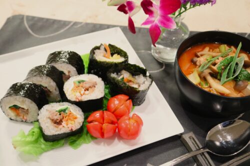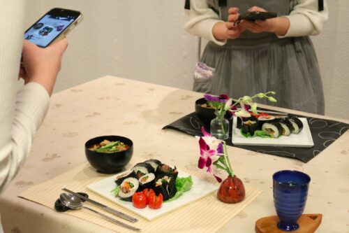 今回は久しぶりに教室にお越しいただいた生徒さん、今月2回目の生徒さん、お二人にお越しいただいてキンパにチャレンジ。ニンジンと菜の花でそれぞれナムルを作り、牛肉を甘じょっぱく炒め、定番のカニカマ、たくあんをを準備して、スライスチーズものせて巻き巻きしていただきました。皆様、海苔巻き初心者ですが、上手に巻くことが出来ました!最後に海苔にごま油を塗って塩を振り、切り方のコツも復習して、キレイにカット。器に思い思いに並べてみたものの、生徒さんが「ちょっと違う…」と感じた部分は少し手直しさせていただきまして、チゲ風スープとともに、写真をパチリです。