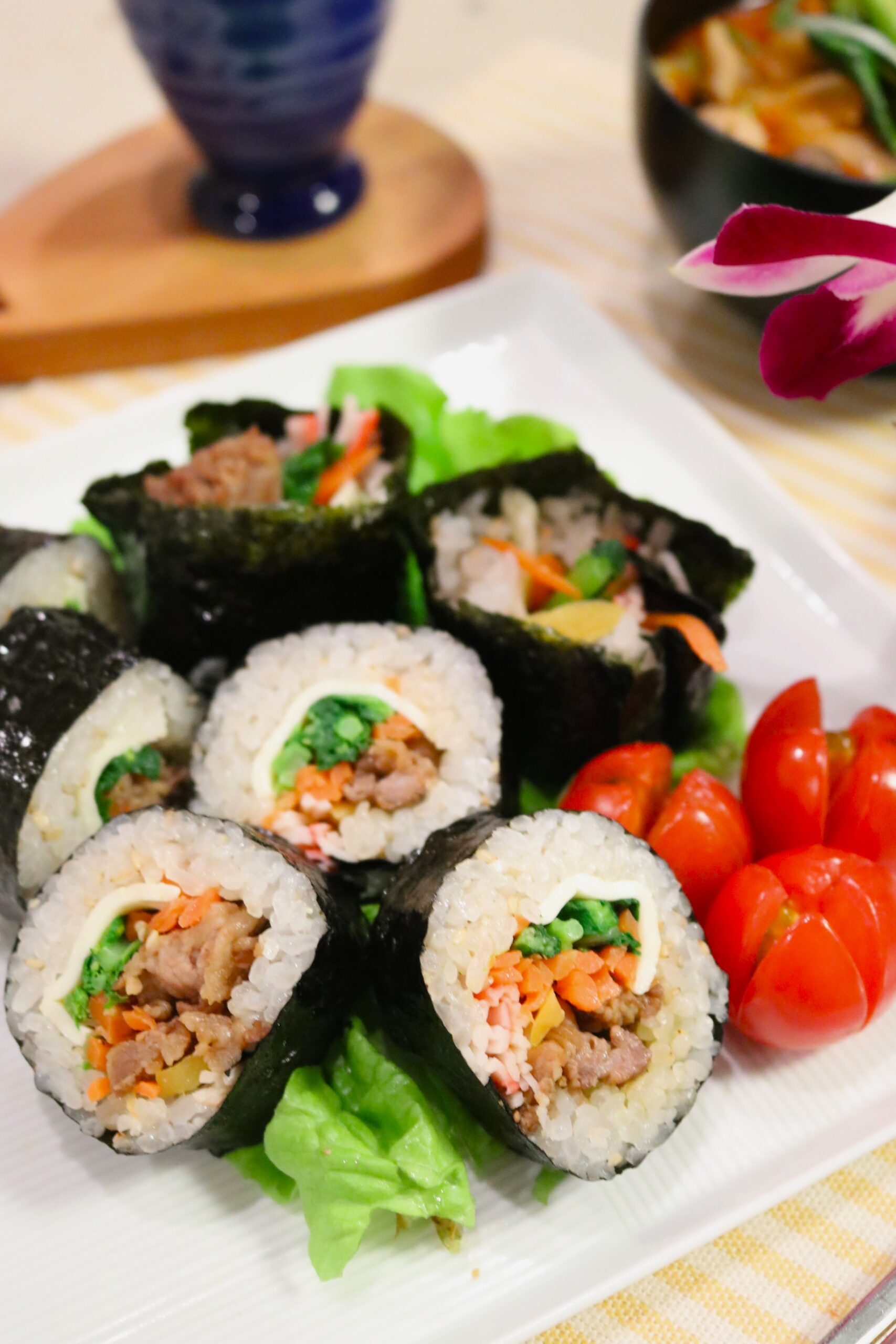 さて教室ですが昨日は夕方からの開催、マンツーマンレッスンを開催しました。今回は二十四節気、立春間近。その前の一大イベント「節分」に合わせまして、海苔巻きのレッスンを開催しました。今回は韓国風の海苔巻き「キンパ」作り。サイドメニューは豆腐入りのチゲ風スープを作りました。