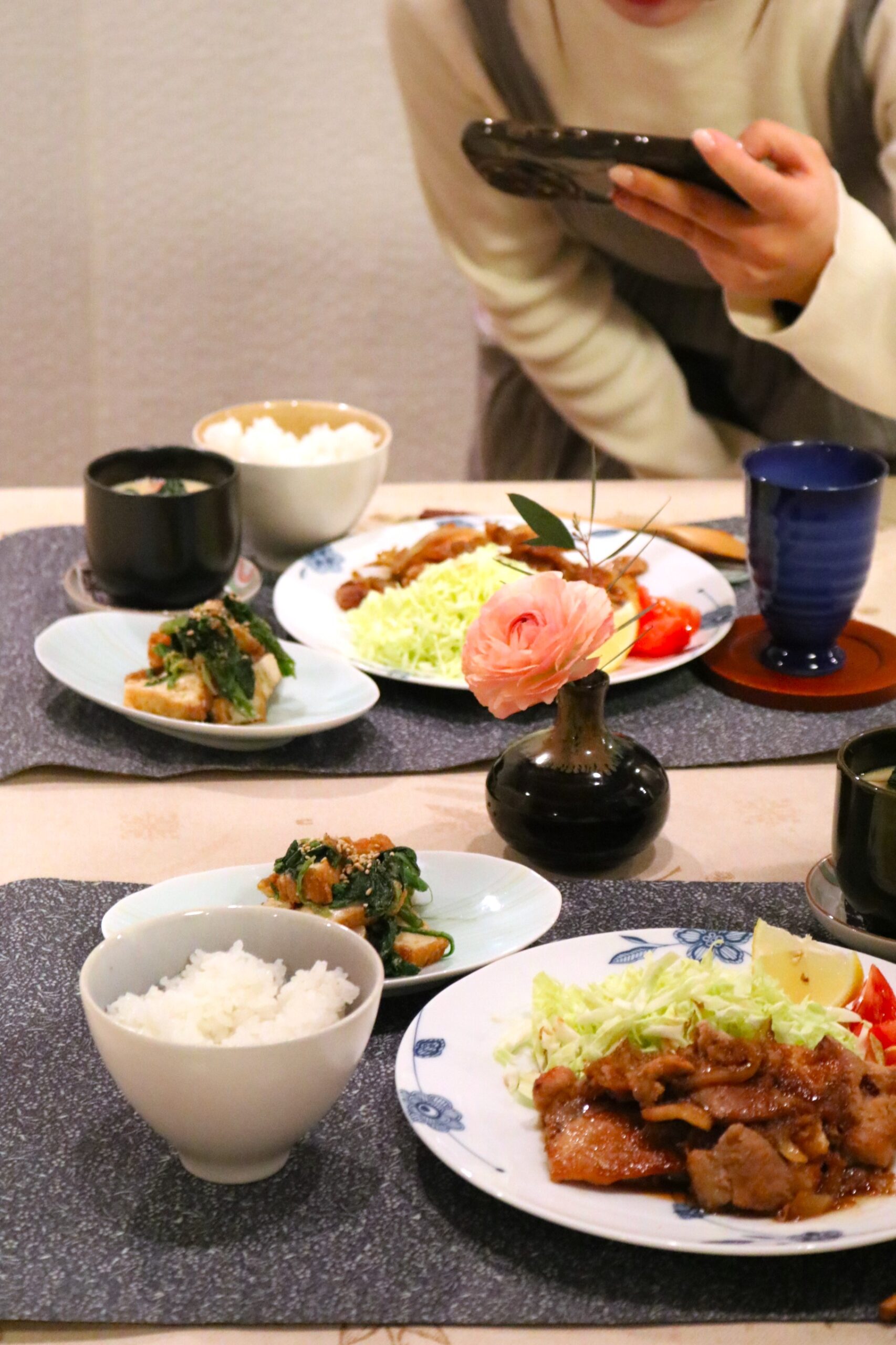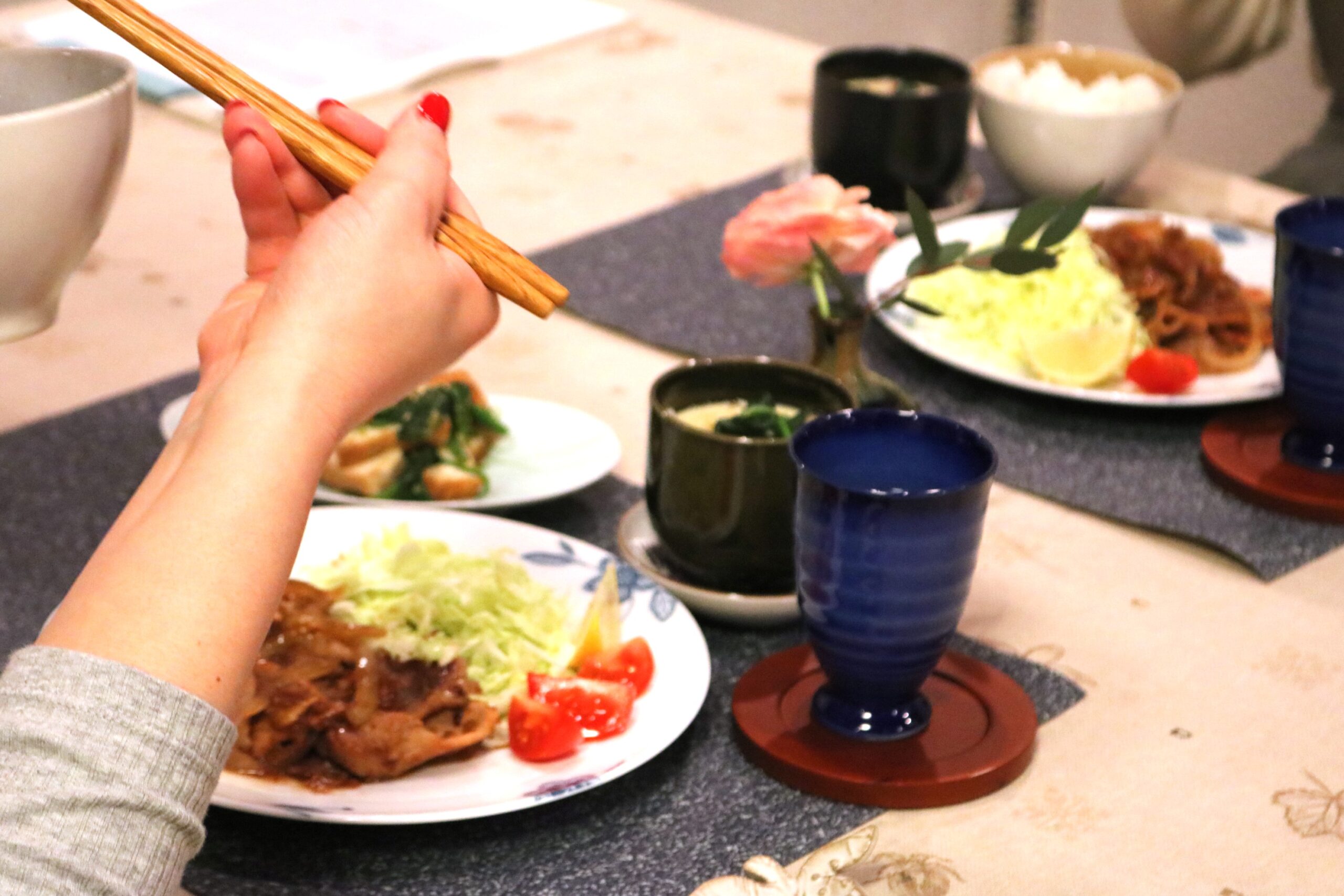 昨日は先月のマンツーマンレッスンでご一緒した生徒さん、お二人が今回もご来場。手分けしてお料理していただきました。ごま味噌和えのごまを炒って摺ったり、しょうが焼きを炒めるとしょうがとにんにくの香ばしい香りが、茶碗蒸しも淡いイエローの上品な蒸し上がりに歓声が上がりました!盛り付けも手分けして、写真をパチリです。