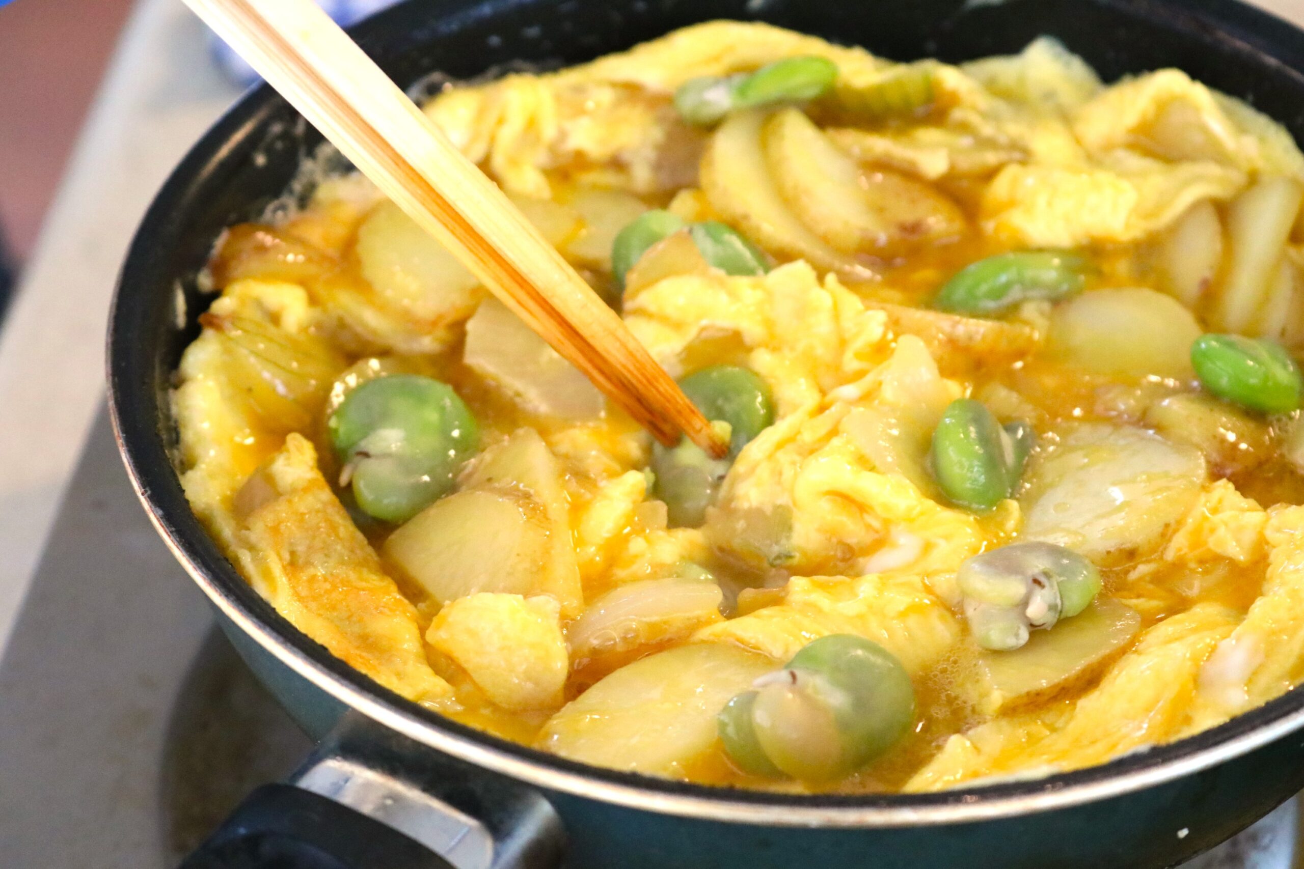皆様こんにちは。先の26日に開催したマンツーマンレッスンのハヤシライスに引き続き、授業開催報告です。こちらは本日の授業の様子。2週前に引き続き、ここのところ開催できていなかった土曜日開催!ステップアップクラス「うくすつぬコース」の授業を行いました。今月は春野菜満載の洋食。新じゃがいもに新玉ねぎ、そら豆を使ったトルティージャに、ゆずこしょう風味の新たけのこと春キャベツのパスタ、旬のかんきつとエビを使ったミント風味のサラダを作りました。