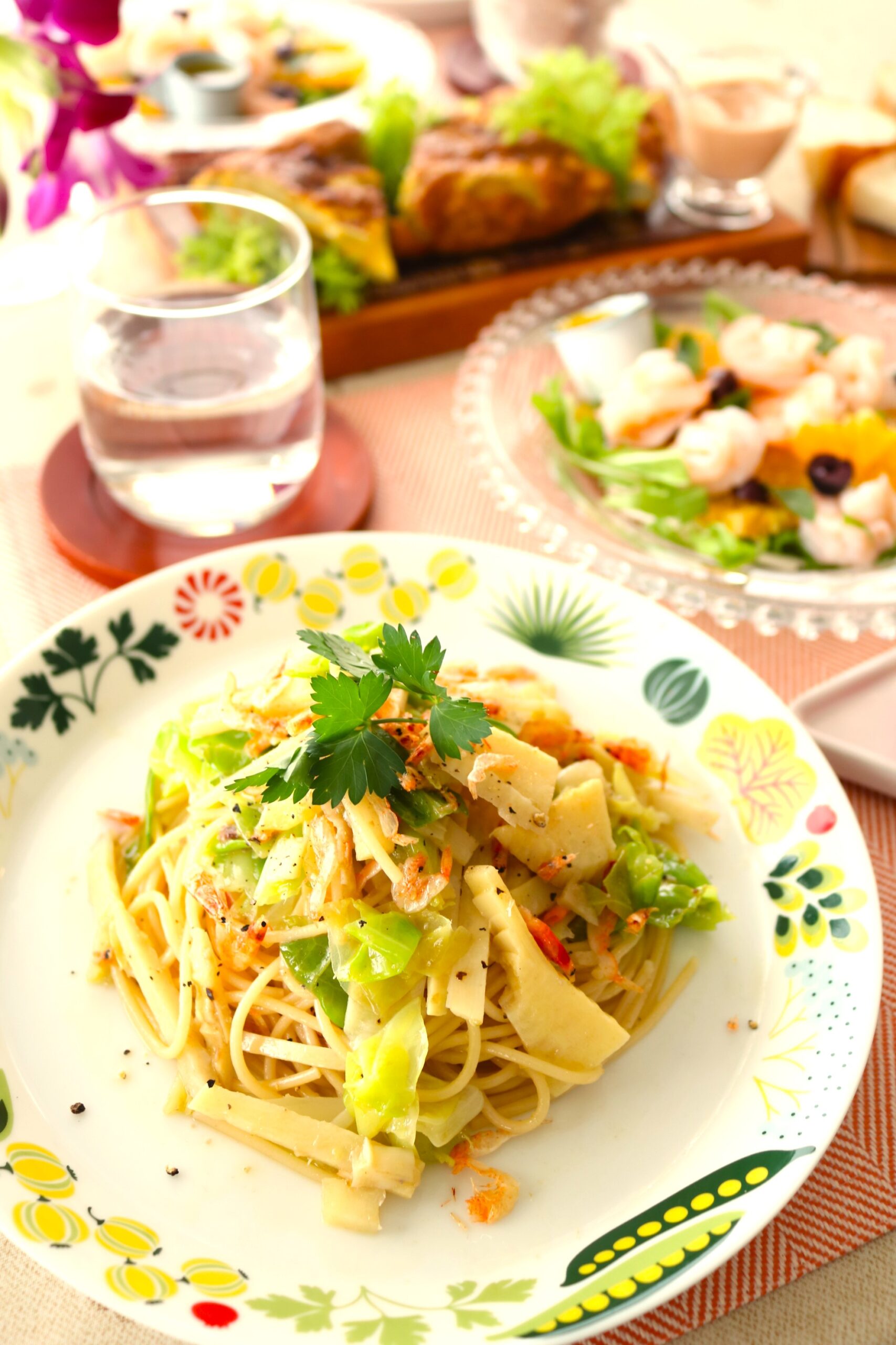 今日は久しぶりの生徒さん、お二人がご来場。まずは新たけのこの扱い方をなんとなく説明して、茹で方のデモンストレーション。その後もサラダに使う不知火、トルティージャの新じゃがいも、新玉ねぎ、そら豆、パスタの新きゃべつ、新たけのこ…春の食材をたっぷり使ってお料理を作りました。出来上がったお料理も春らしくセッティングして、写真をパチリです。